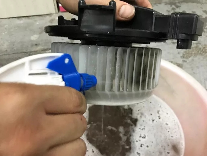 先拆下空调吹风机,之后插入可视化设备,将第一次去污剂通过可视设备喷射到汽车空调内进行清洗。