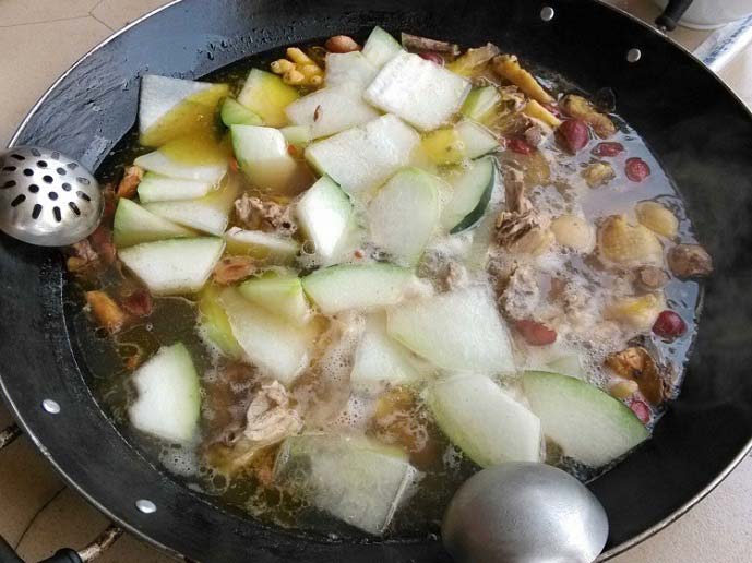茶山的农庄都是以水浸鸡为主,鸡是正宗的走地鸡,如果吃鸡项的话三人可以吃两只。吃法以打边炉为主,用茶山的五指毛桃作汤底,用茶山的靓山泉水去煮,这样煮出来的鸡肉带甜。水滚后就把鸡肉放到锅里煮,不用盖锅盖,搞一搞就可以吃,这样吃的鸡肉是最滑的。另外在茶山吃饭都是送1份青菜,而饭是免费的。
