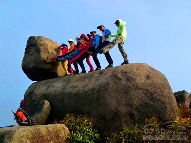 行了大约一个钟的上坡路,腿开始没力气了,一路还算好走!中间一位菜鸟驴友很搞笑,鞋烂了没法再前行了,领队以安慰的语言引导他下山…终于行到了一些奇形怪石的路了,大家爬累了都坐着小休息一会,我想前面好像没路了怎么走?这时领队以春天般的微笑对大家说:现在的路全是大石头了,我们要攀爬上去,听到这里我的心无比惊恐,无试过哇…但我回头一想,我是来探险的,又不是来渡假的,这样的小石头如果让我害怕,那以后的猪獏狼马疯叫我如何面对?依是我绑紧鞋带…冲呀!适应了三分钟的攀爬状态之后,我觉得这石头已经毫无压力了,一路闯关斩石,差不多走在队伍的最前面了,但我想了一想我是一个新人,不可以表现得太突出,必须要服从领队!再看后面的驴友菜鸟们有的还在千里之后,依是我发挥了团队精神,回头给于一些驴友伸手和鼓励…领队也不时的出现在我面前给于我春天的微笑…中间有一位菜鸟驴友不小心秋根了,我们又小作休息等待着他…终于攀完了石头路?我看一下表,靠!用了两个多钟时间?真是快活不知时日过?之后真的活路行了,全是丛林高树,这时我们的老雀驴友拿着大砍刀跑在前面做开路先锋,就这样大家碰碰跌跌的,终于到了山顶……