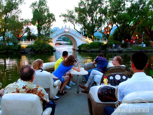 第二天:早上9点钟吃过早餐后去遇龙河码头游船(可从到金龙桥码头游上半程,用时为3小时,或者到朝阳码头游下半程,用时为1.5小时,如果你有足够时间的话还可以游全程,用时为5小时,当地人觉得最靓的是上半程,而旅游团多数游下半程,因为河段短,用时少,其实下半程的景观可以在工农桥或河岸小路边观赏得到,下船后可以在码头租台摩托车到上船码头位置取车继续自驾游)——12点钟在工农桥附近农庄吃饭(吃饭1.5小时)——下午1点半钟去大榕树景区(5分钟到大榕树景区,游玩40分钟)——2点15分钟去月亮山(5分钟到月亮山,观赏10分钟)——2点半钟去银子岩(15分钟到银子岩,游玩1.5小时)——下午4点钟回江门——5点半钟在贺州吃晚饭(吃饭1.5小时)——晚上7点钟继续回江门(3.5小时能到江门市区)