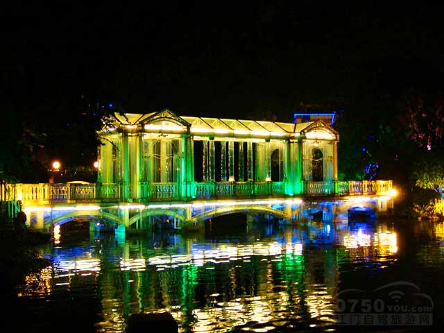 玻璃桥位于榕湖,桥体采用工艺复杂,造型考究的水晶玻璃制品为建筑构件,集中体现了现代玻璃工艺的水平,是目前为止我国最早采用特种水晶玻璃承重体系的实用性桥梁。桥型美观大方,桥体晶莹剔透。特别是夜晚,通过高科技夜景配光,更加七彩斑斓绚烂夺目。